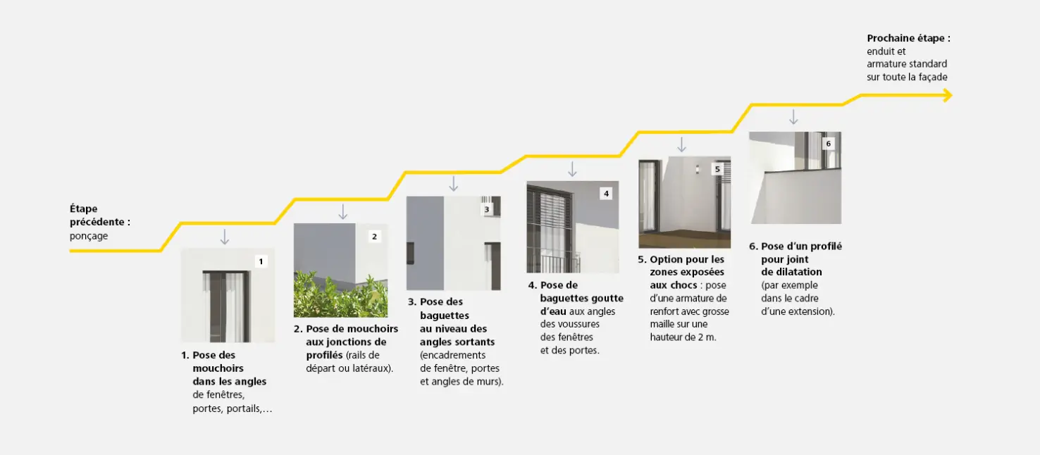 Il est indispensable de poser des éléments de renfort pour éviter tout risque de fissuration et d’impact sur la façade. La pose de ces éléments de renfort doit être réalisée avant la mise en œuvre du sous-enduit armé, sur l’ensemble de la façade.