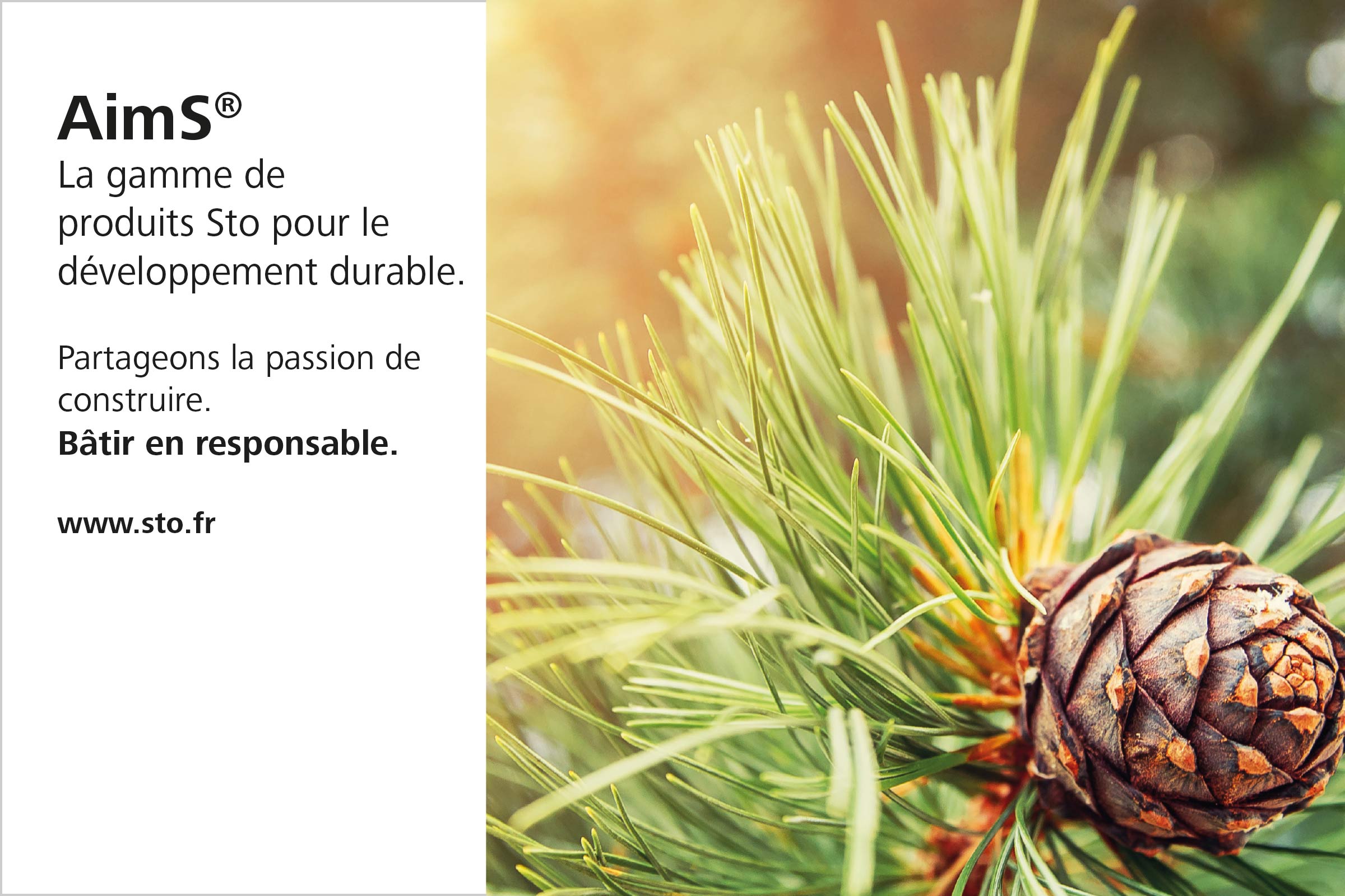 Fidèle à sa devise, Sto souhaite offrir à ses clients, qu’ils soient maîtres d’ouvrage, prescripteurs ou applicateurs, des solutions leur permettant de construire de manière durable et en toute conscience, tout en conservant d’excellentes performances et propriétés de mise en œuvre. Qualité, protection du climat et préservation des ressources sont les mots d’ordre de la nouvelle ligne de produits développée par Sto, baptisée AimS® (Aim Sustainability = Objectif Durabilité). Avec sa gamme AimS®, Sto entend contribuer à établir durablement l'utilisation de produits et matériaux respectueux de l'environnement dans le secteur de la construction. « Pour développer AimS®, notre objectif était le suivant : les nouveaux composants ne devaient pas être obtenus en faisant concurrence à l'industrie alimentaire, ils ne devaient contenir ni éthanol, ni huile de palme et en aucun cas être associés au travail des enfants ou à de longues distances de transport.