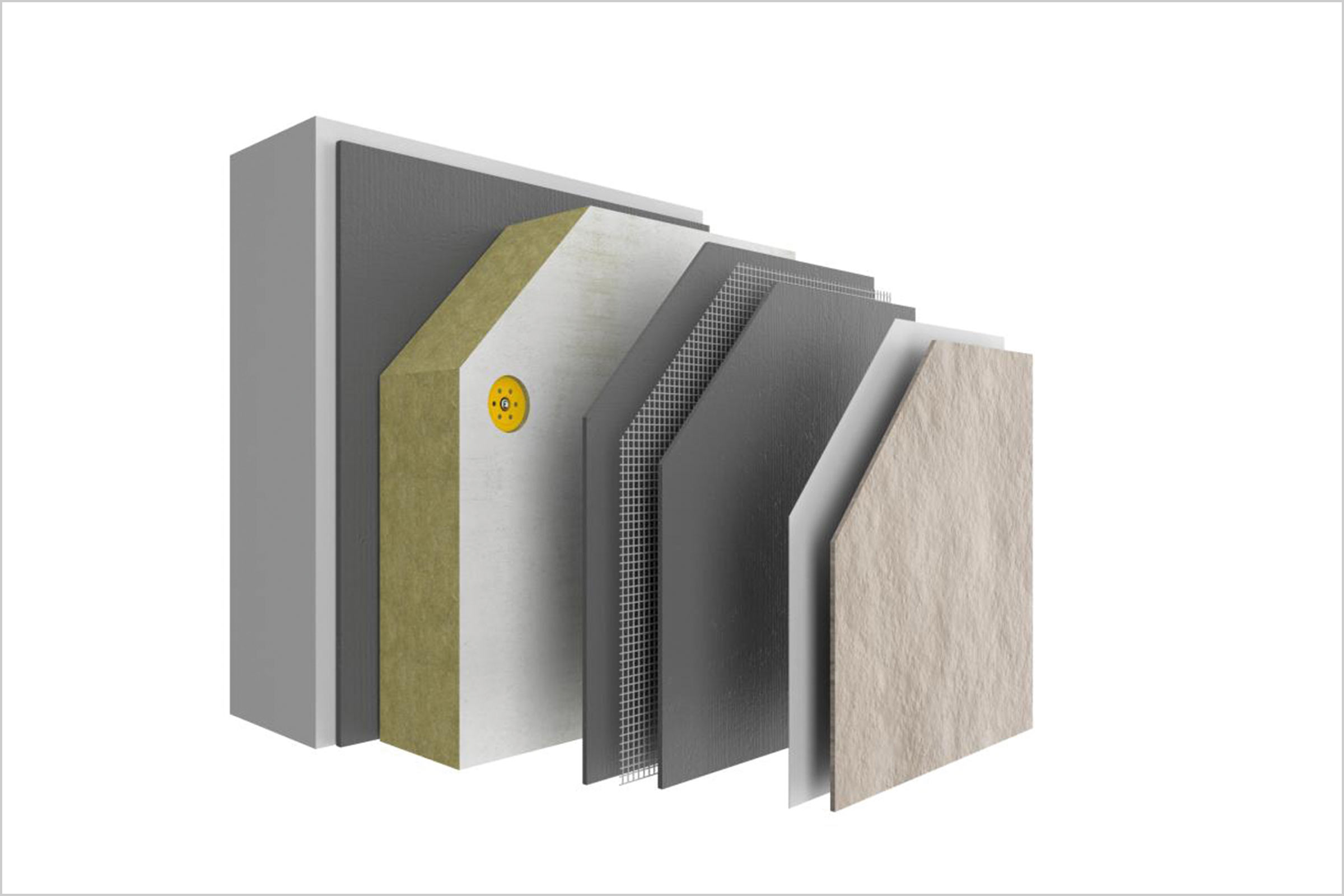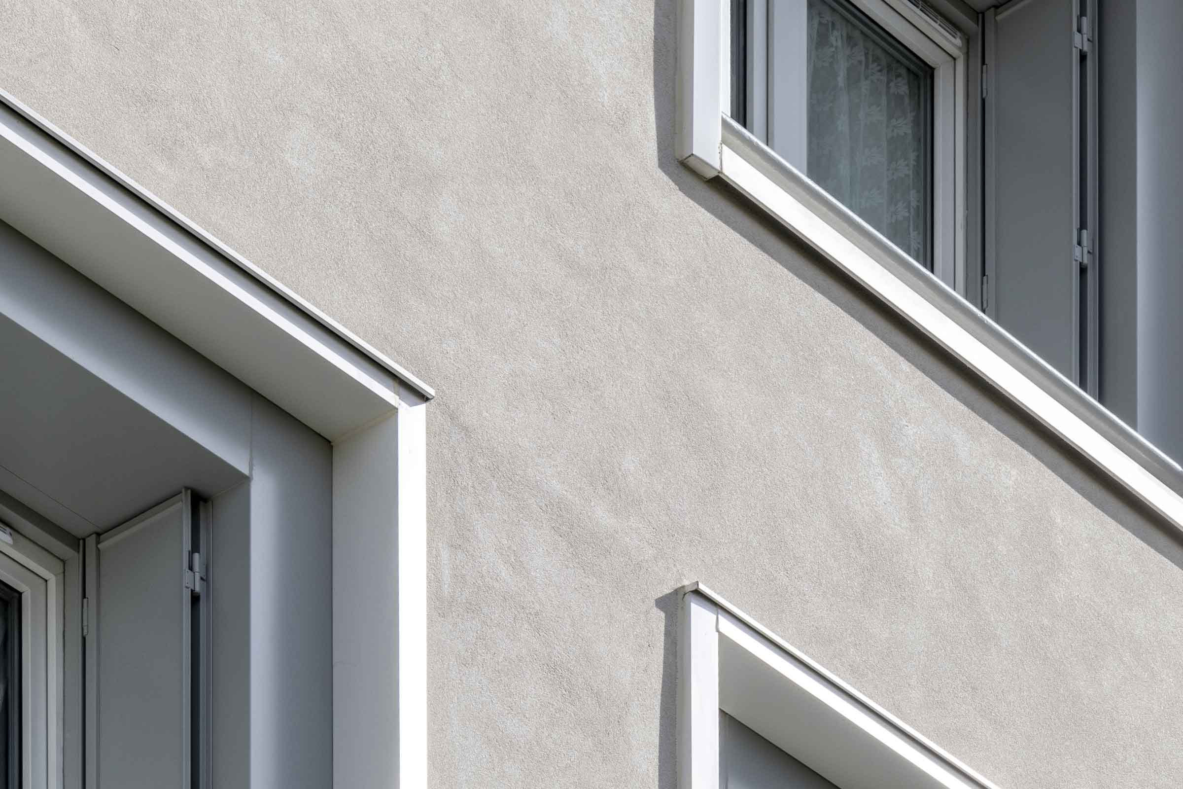 Les panneaux de laine de roche de 140 mm d’épaisseur de l’ITE sont calés et chevillés sur le mur de façade. L’enduit de base StoLevell Uni blanc est posé manuellement, à la taloche, et une trame en fibre de verre est marouflée dans cet enduit. L’enduit de parement teinté Stolit K1 est ensuite appliqué avec une finition talochée. L’habillage des avancées des halls d’entrée est réalisé au moyen du bardage ventilé StoVentec R. Les panneaux supports de l’enduit, fixés sur une ossature en bois, reçoivent un sous-enduit mince, armé d’un treillis de fibre de verre. La finition est assurée par un enduit à l’aspect de béton. Il s’agit du Stolit Milano, appliqué à la spatule en plusieurs étapes. Une couche de Stolit K1 est d’abord appliquée. Après séchage, l’enduit Stolit Milano est à son tour posé en raclant légèrement dans toutes les directions. Après quelques jours, on procède au ponçage. Le soubassement est peint en gris avec la peinture StoColor Jumbosil.