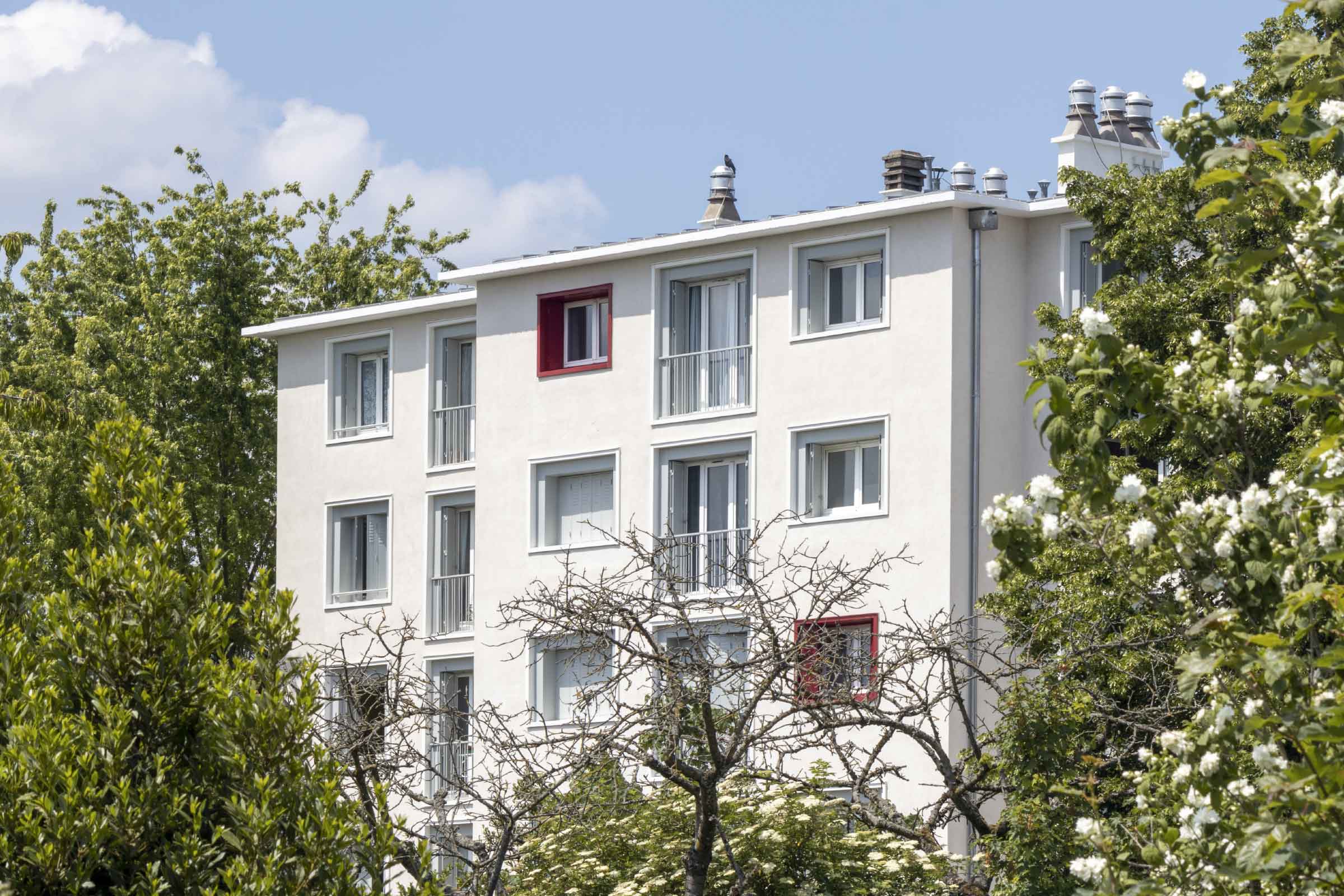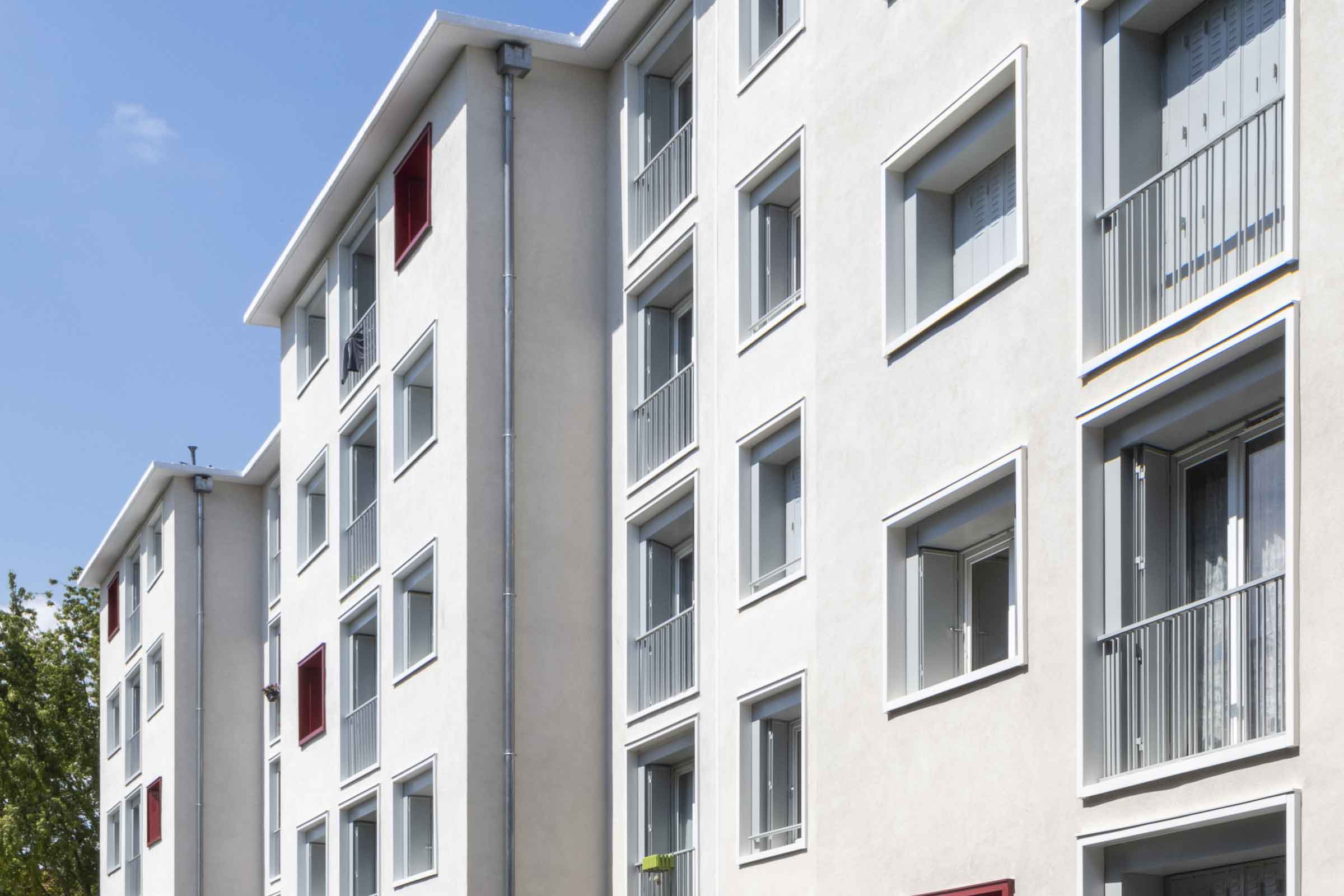 Pour donner une image plus contemporaine au bâtiment, le maître d’œuvre ECI Management propose de souligner toutes les baies vitrées par des cadres métalliques en tôle d’aluminium laqué pliée de teinte grise/blanche et ponctuellement de couleur rouge, dans le cadre de la réhabilitation thermique extérieure revêtue d’un enduit monocouche gratté beige clair. « Ces pastilles de couleur viennent dynamiser la lecture de la façade », expose Alexandrin Chorao, dirigeant d’ECI Management. Les façades des halls d’entrée, en décrochement, sont marquées par une couleur grise qui se fond avec la teinte utilisée pour le soubassement.