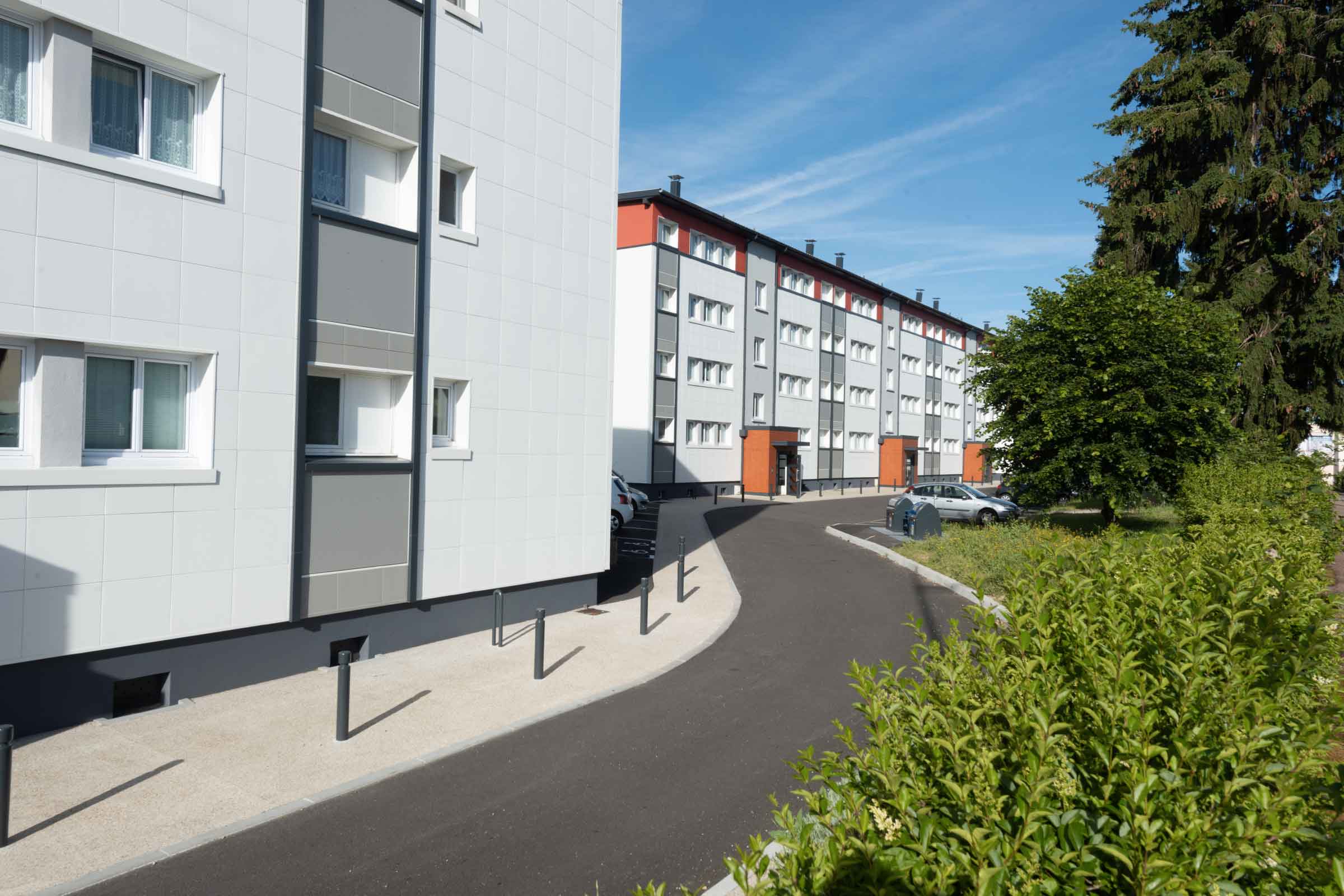 Construits en 1955, les deux bâtiments R+3 ont été réhabilités au début des années 2000. Le système d’isolation thermique par l’extérieur mis en œuvre à l’époque demeure efficace mais sa couleur rose fade uniforme sur l’ensemble des façades donne un aspect vieillissant. La société scalis lance un appel d’offres de maîtrise d’œuvre à l’issue duquel est retenue la SAS d’architecture STI – DESIGN STUDIO EU. Pour mieux distinguer les différentes parties de la façade, celle-ci est décomposée en trois bandes horizontales : le soubassement est marqué par une couleur gris foncé, la partie centrale des logements est blanche et gris clair, et enfin une bande rouge habille le dernier étage. La longueur des bâtiments est quant à elle rythmée par des bandes verticales grises qui marquent les cages d’escalier et les allèges des fenêtres isolées. Enfin, des profilés anthracite viennent souligner les contours des zones de couleur.