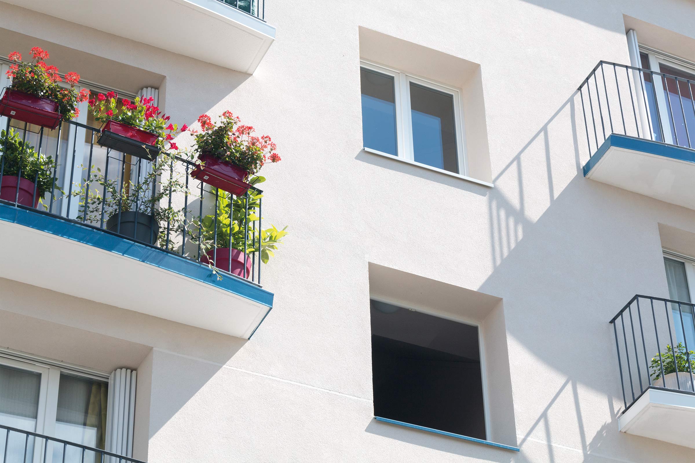 L’équipe de quatre échafaudeurs et dix enduiseurs est complétée par trois peintres qui assurent l’application, sur les balcons, de 800 m2 de système d’étanchéité liquide (SEL) Sto-Polydal et, sur les soubassements, d’une peinture en teinte gris soutenu. « Ce type de couleur blanchit souvent avec le temps, note Yahya Dahmani. Cependant nous avons déjà utilisé une peinture en teinte foncée Sto sur un autre chantier en 2014, qui n’a pas bougé, donc on ne change pas une équipe qui gagne ! » Les appuis de fenêtres et les nez de dalles de balcons en béton, souvent dégradés, ont été habillés de capotages en tôles d’aluminium laqué pour éviter un vieillissement prématuré.