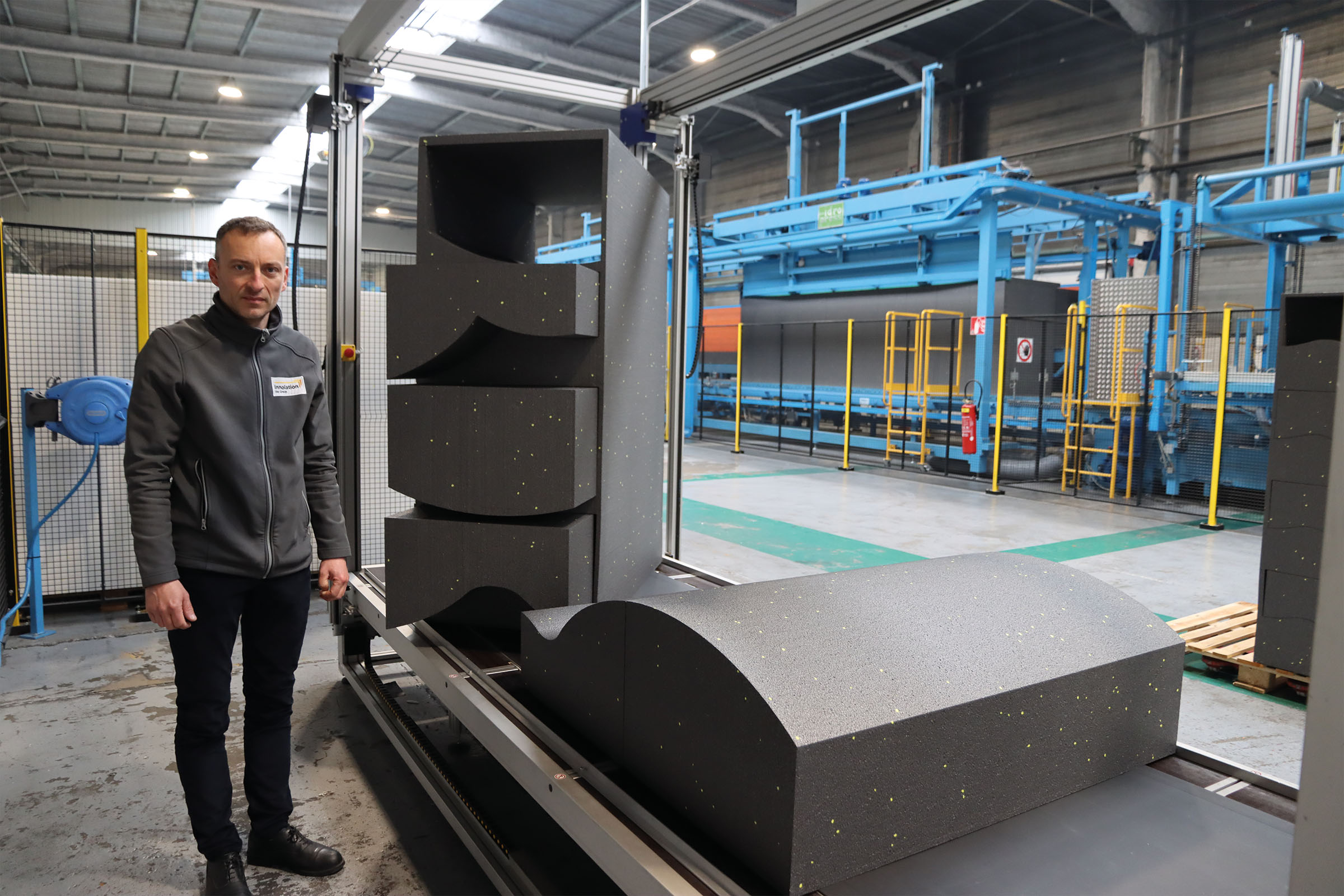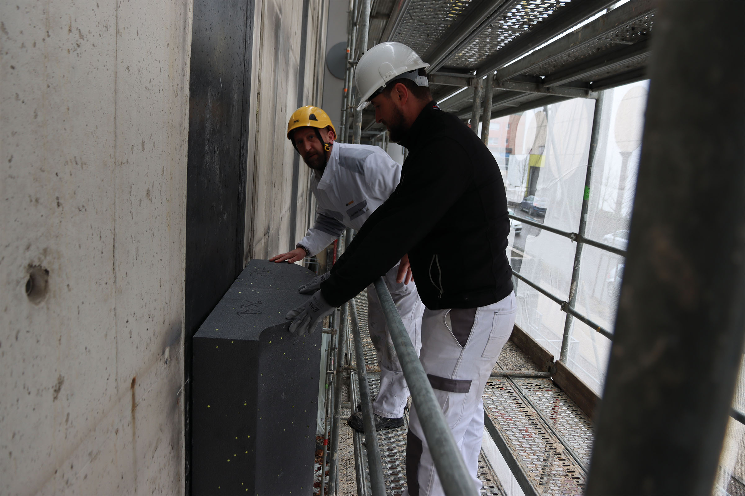 Proposé au maître d’ouvrage moins de six mois après la demande initiale, ce prototype a permis de valider l’habillage en PSE et la teinte de la peinture. La production des panneaux a pu alors commencer dans l’usine d’Innolation à Amilly (45). « L’enjeu était d’être très rigoureux sur les découpes réalisées, par exemple en assurant des arrêtes bien vives sur tous les côtés pour que les pièces soient bien jointives. Nous avons aussi cherché à optimiser la production en coupant dans les mêmes blocs des panneaux positionnés à des endroits très différents de la façade, mais d’épaisseur identique », rapporte Fabrice Cochet, responsable des opérations d’Innolation. Ce travail minutieux a abouti à la production de près de 500 panneaux proposés dans 99 modèles différents : toutes les pièces ont été numérotées pour permettre leur mise en œuvre. Un véritable puzzle, dont l’assemblage a été confié à l’agence forbachoise du réseau Les Peintures Réunies SN.